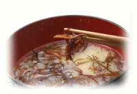 紅藻類ふのり科ふのり属の海藻。水で戻し、刺身のつまやみそ汁の具、そばのつなぎなどに使われる。